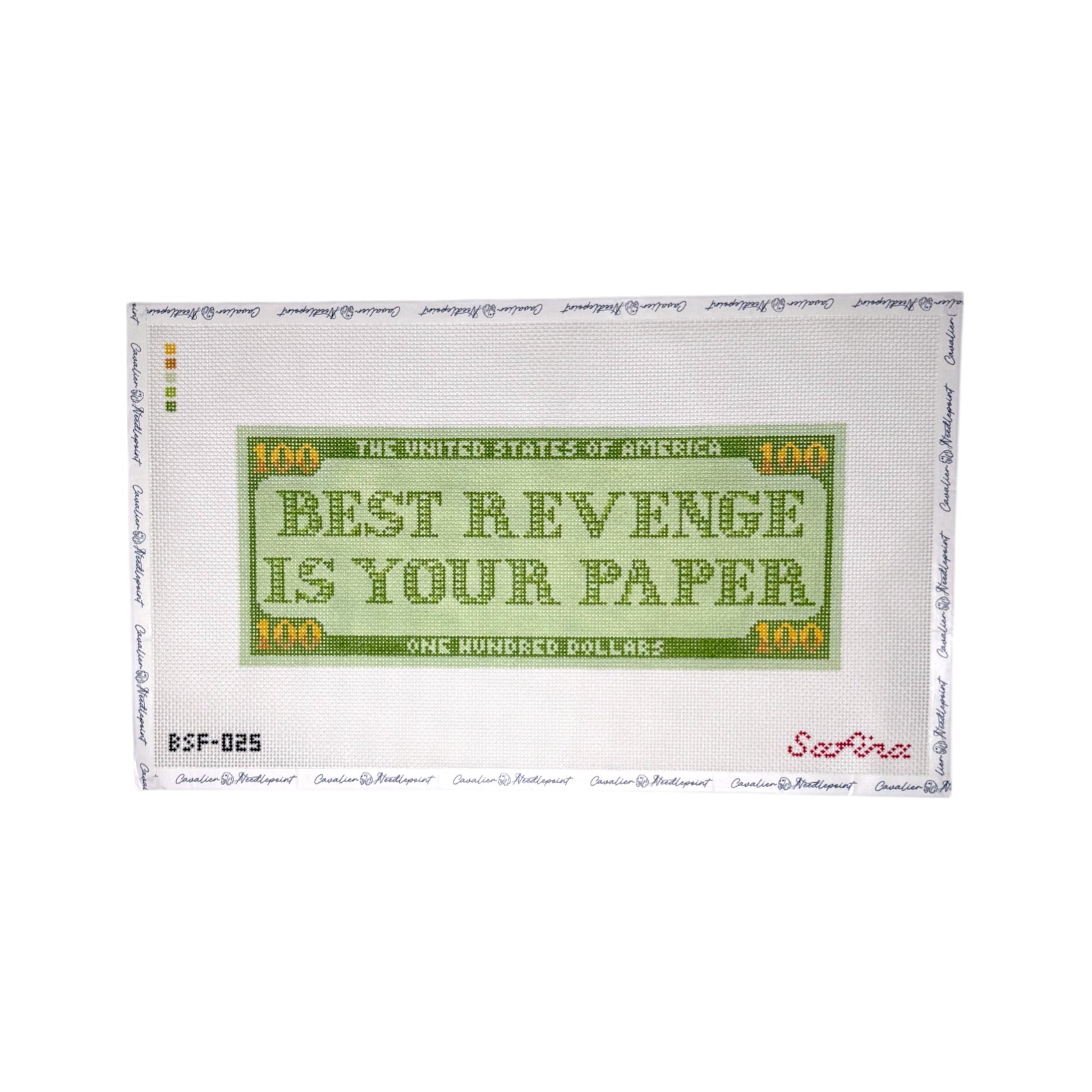 Inspired by timeless wisdom about success and gratitude, this hand-painted needlepoint canvas features an iconic hundred dollar bill design with "Best Revenge Is Your Paper" text—a stylish reminder to stay focused on your goals and celebrate your wins. The design measures approximately 5.2" tall by 13.08" wide, on a 10" tall by 17" wide 13-mesh canvas. Perfect for adding motivational flair to any space.
