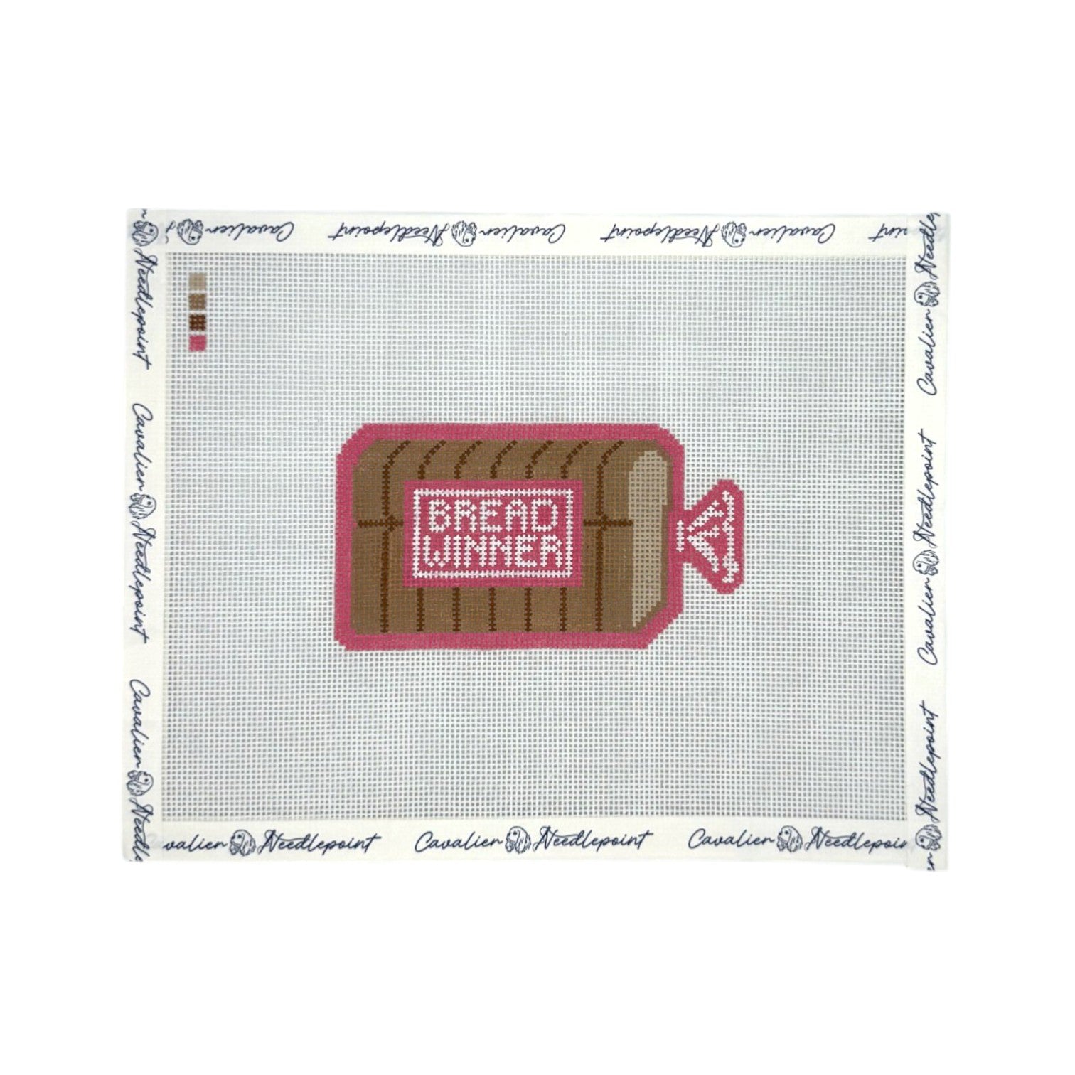 Hand-painted needlepoint canvas featuring a charming loaf of bread nestled in a pink bread bag with "Bread Winner" label design. Design measures approximately 2.5" tall x 4.5" wide on a 7" x 9" canvas. Hand painted on premium 18 mesh canvas.