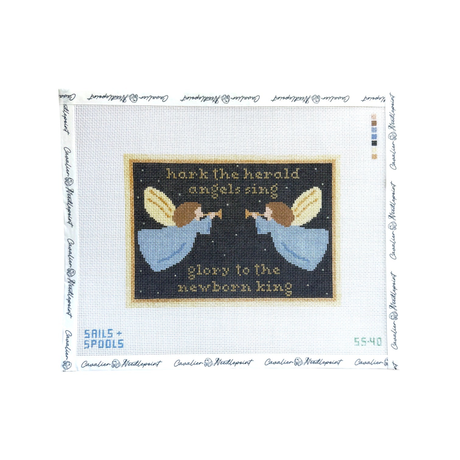 Celebrate the holiday season with the charming Hark the Herald Angels Sing needlepoint canvas. This hand-painted, in-house design on sturdy 18-mesh canvas measures 5" x 7", making it ideal for creating a festive hanging sign, tray insert, or pillow. Its timeless motif brings warmth and joy to your Christmas décor while offering a delightful stitching experience.