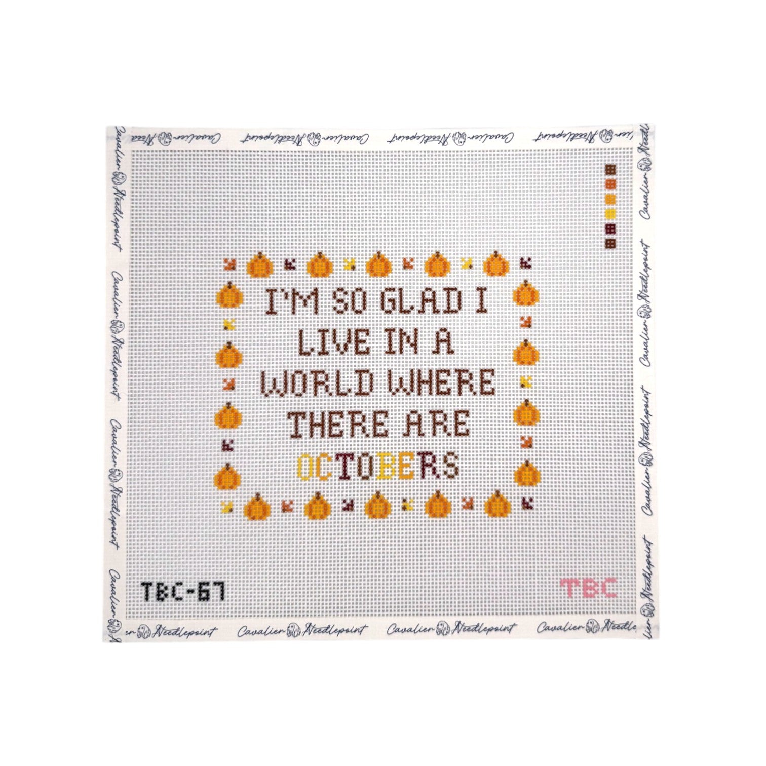 Celebrate the magic of autumn with this charming needlepoint design featuring the beloved quote, "I'm so glad we live in a world where there are Octobers." Hand-painted on 13 mesh canvas, this 6.7" x 5.5" piece captures the cozy spirit of fall in every stitch. Perfect for framing, pillow covers, or as a thoughtful gift for anyone who treasures the season's crisp air, golden leaves, and quiet moments of gratitude.