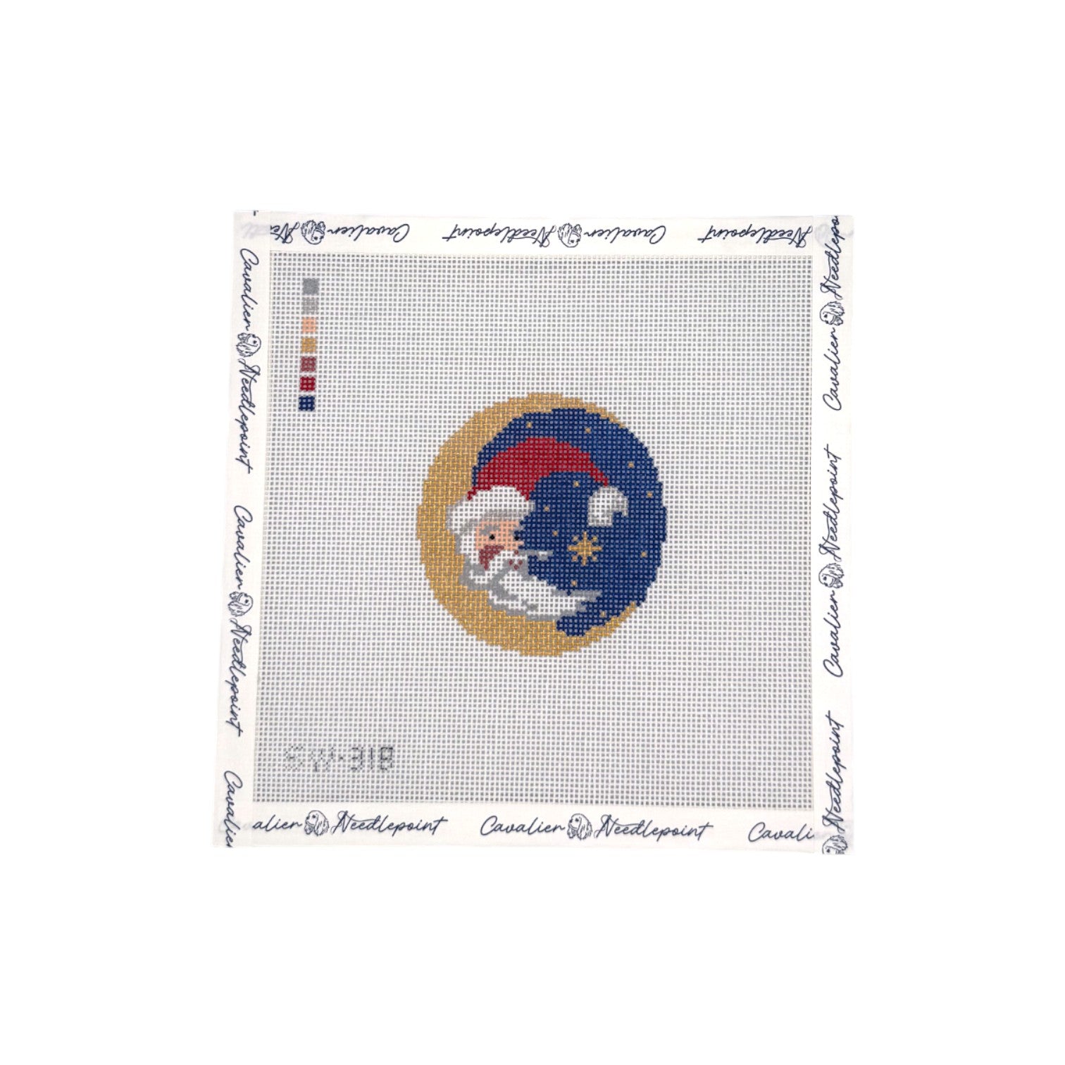 Bring festive charm to your needlepoint collection with this delightful Santa Moon design. This 3-inch round is hand-painted on a 18-mesh canvas. Ideal for ornaments, small framed pieces, or decorative accents, this compact size makes it an enjoyable project for both experienced needlepointers and those looking to try a smaller design.